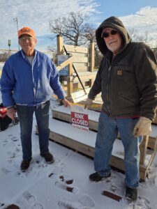 On Monday afternoon, December 15, 2025, Lyle Bush, left, and Chuck Finley shoveled the rink. The rectangular surface area measures 44 by 88 feet. These volunteers shoveled 3872 square feet of snow from the ice!