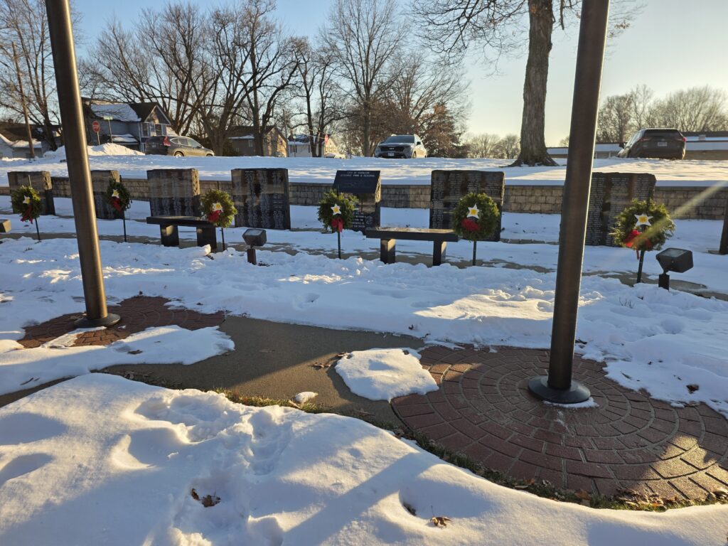 Lighted wreaths representing each branch of the United States military were installed in front of the stone tablets. Community members wishing to view them are invited to enter the park at the Cherry Street entrance, follow the curve to the left, and exit at the Genesee Street intersection.